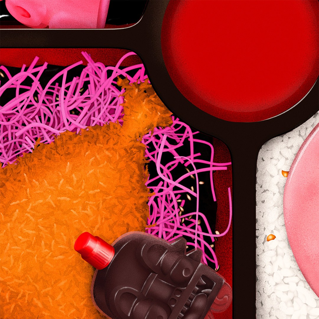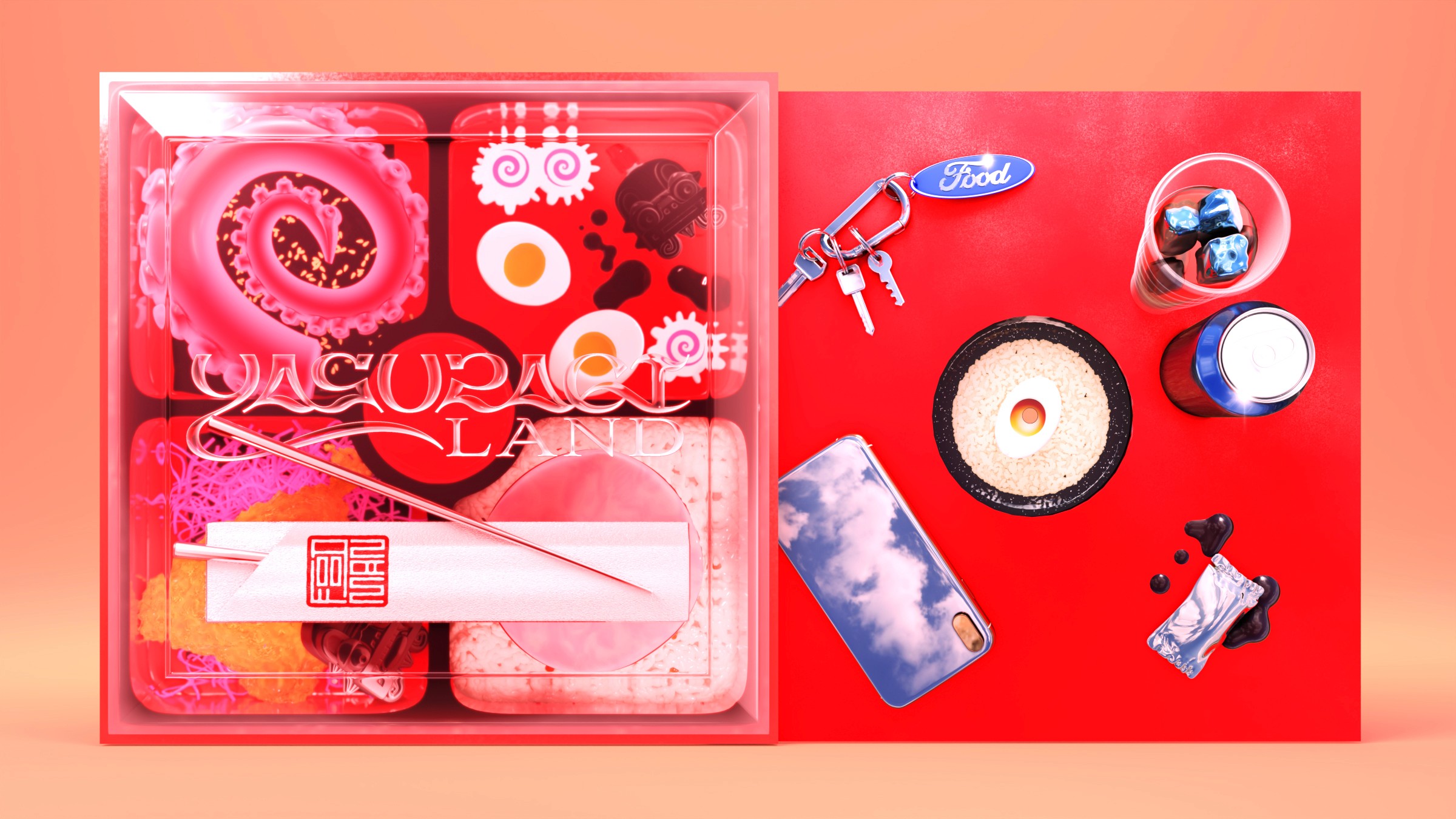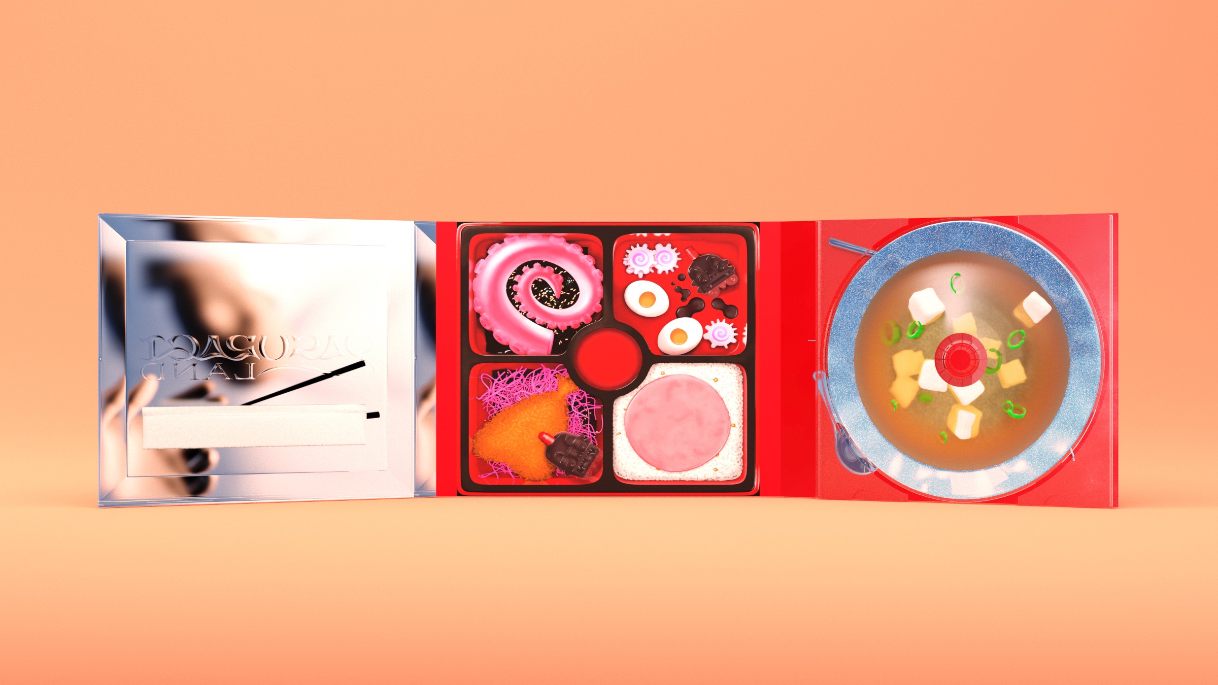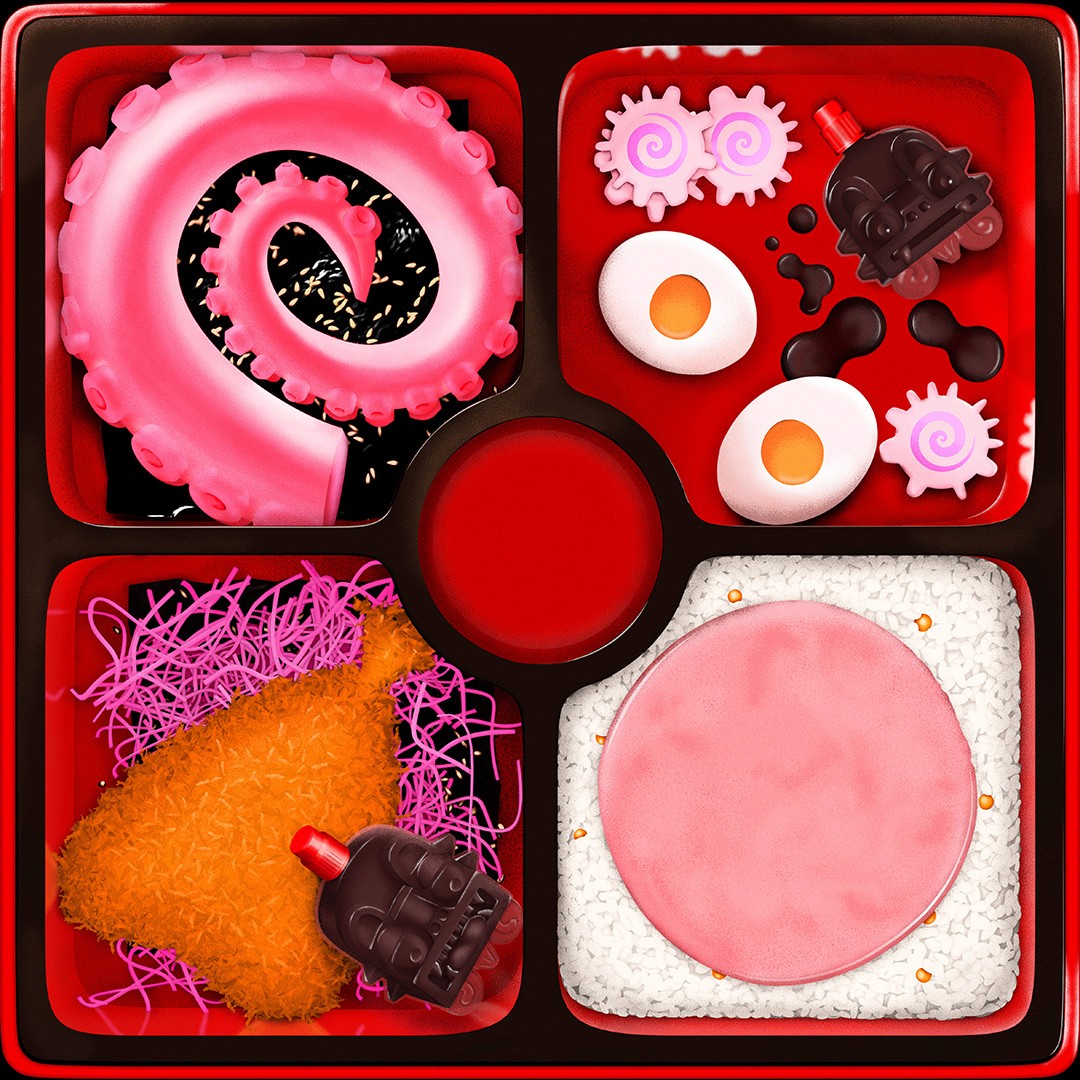 Inspired by his time spent eating bento boxes from Japanese gas stations during the Covid 19 Pandemic, the Japanese artist "Foodman" asked us to bring this idea to life for his album on the record label "Hyperdub". We wanted to recreate the feeling of bento box through the design of the record, that in physical form recreates the experience. Featuring various weird and wonderful squishy textures, all rendered in an airbrush style artwork.