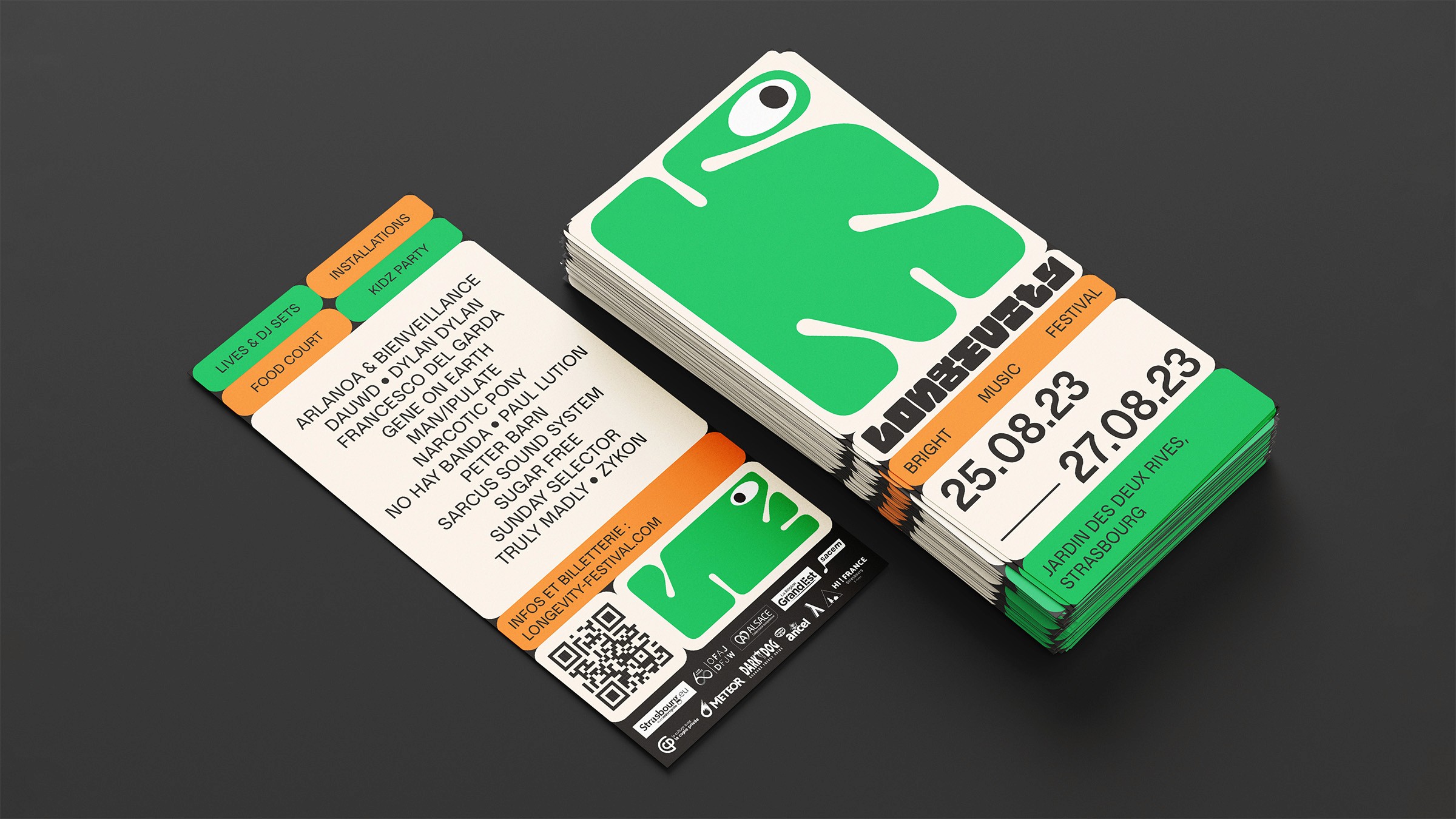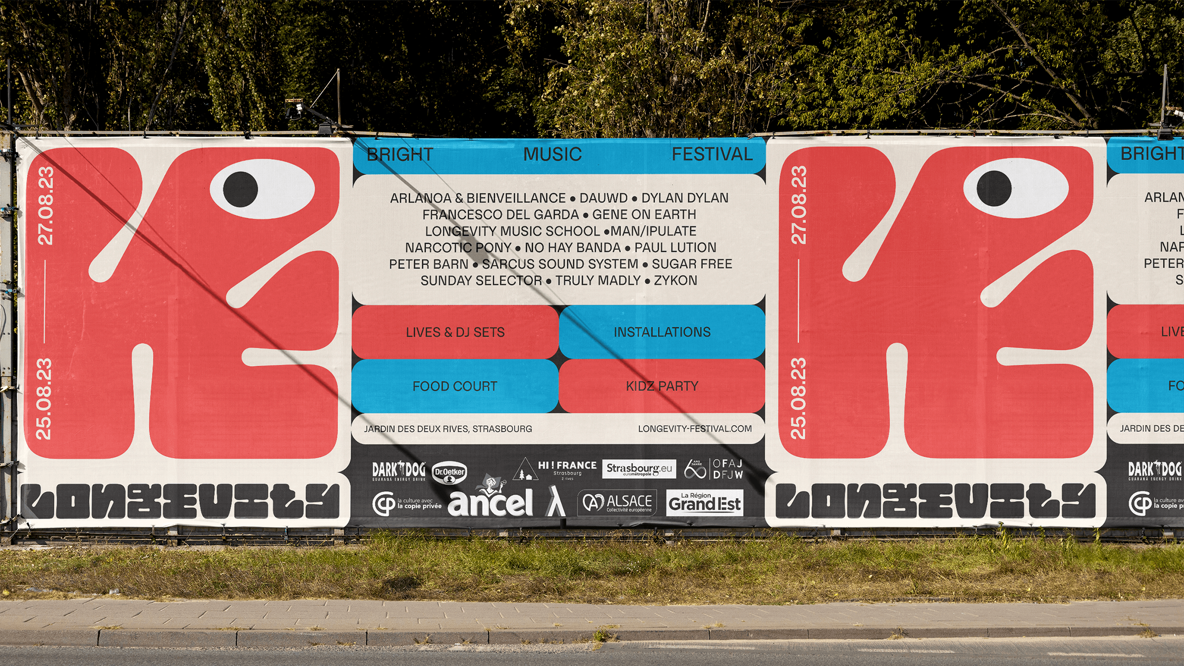 The team at Longevity Festival in Strasbourg, approached us to create the branding for their 2023 edition. The festival covers 3 days, featuring various artists and DJ’s as well as installations and kids events. We wanted to create something that spoke to a wide range of audiences. The branding had to cover both print and digital applications, and was exhibited around Strasbourg in the months leading up to the festival.